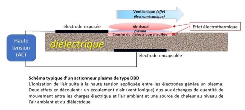 Ma thèse s’intègre dans le cadre du projet VERGLAS dont l’objectif est de développer un nouveau système de protection contre le givrage des aéronefs (formation de glace après impact de gouttes sur des surfaces froides) en utilisant un actionneur plasma de type « Décharge à Barrière Diélectrique » (DBD). Ce dispositif crée une tension élevée entre deux électrodes placées de part et d’autre d’un isolant, engendrant un plasma qui chauffe à la fois l’air ambiant et l’isolant. Les applications de ce dispositif sont nombreuses, notamment dans l’aéronautique et l’éolien où le givrage pose problème et les systèmes utilisés pour y remédier sont énergivores.