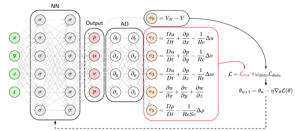 Depuis son introduction en 2018, le paradigme novateur des réseaux de neurones informés par la physique (PINNs) fait l’objet d’une attention grandissante motivée par leur flexibilité dans le traitement d’un large éventail de problèmes impliquant des équations différentielles partielles (EDP). L’approche PINN permet d’intégrer de manière transparente les informations provenant à la fois des mesures expérimentales et des EDP en intégrant les EDP dans la fonction de perte d’un réseau de neurones artificiels à l’aide de la différenciation automatique.