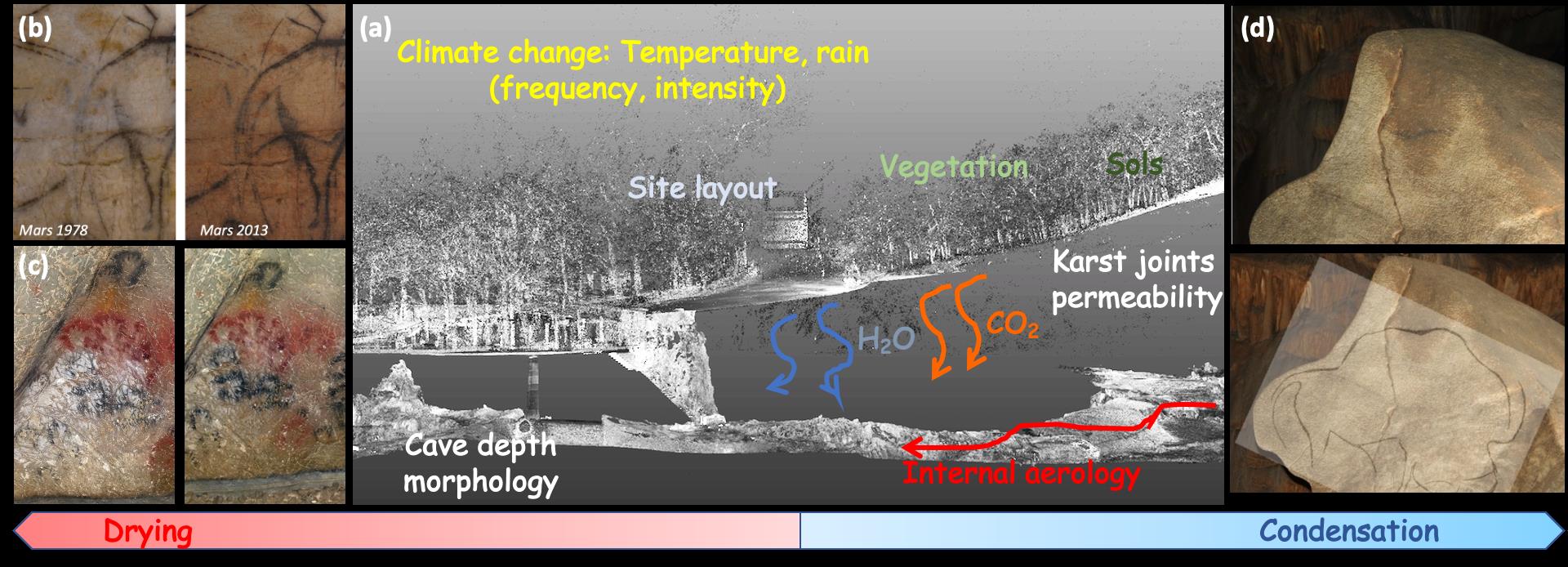 The effects of global warming are felt even in historic cave paintings where rock drawings preserved for thousands of years are being impacted. The conservation of these drawings, which are located at the interface between the rock surface, the atmosphere and a thin film of water that covers them, is the result of a fragile balance, which is undermined by the change in the cave’s airflow generated by the increase in the temperature difference between the surface and the bottom of the cave. The increase in CO2 concentration in the air also plays a negative role and contributes to more solid deposits and corrosion on the surface.