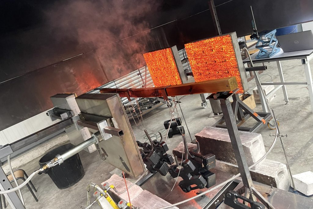 Dans un second temps, la thèse se concentre sur l’étude du comportement mécanique et hydrique de poutres en bois soumises à des essais de flexion quatre points, tout en étant exposées à des panneaux radiants permettant d’atteindre des flux thermiques contrôlés et représentatifs de conditions d’incendie.