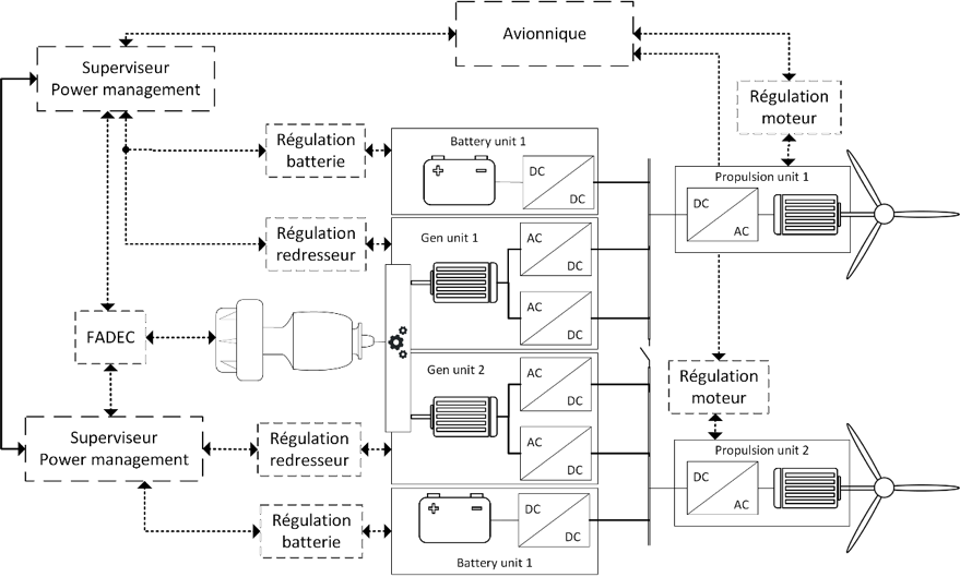 La révolution technologique majeure des nouveaux aéronefs repose sur une électrification intensive de nombreux constituants des appareils et sur le fait que la vitesse des génératrices électriques devient variable. L’architecture développée permet d’assurer la stabilité dynamique lorsqu’on recherche un compromis entre efficacité énergétique, respect des normes et compacité.