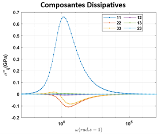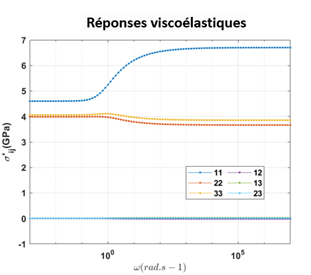 Figure 2 : Réponses mécaniques du matériau composite viscoélastique sous un chargement de traction selon la direction (11) pour une discrétisation de 128³. À gauche, la partie réelle des contraintes ; à droite, la partie imaginaire.