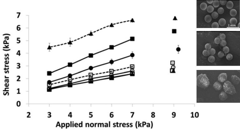 Evolution du comportement rhéologique (cellule de cisaillement) pour différente formulation de poudres : billes de verre de 500 µm de diamètre, billes recouvertes de lactose et particules de lactose agglomérées